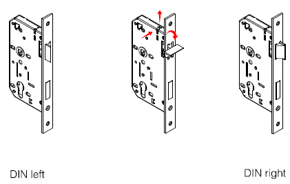 將鎖體倒置,擋塊自然下落,用手將斜舌壓入,再用一字螺絲刀將斜舌拖板向後撥至斜舌能轉向180,再讓其複位