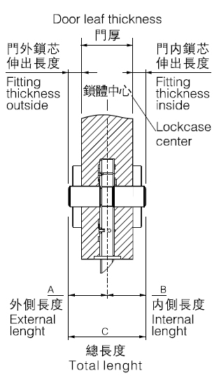1. 鎖芯的總長度等於門厚加上門兩側鎖芯突出長度之和